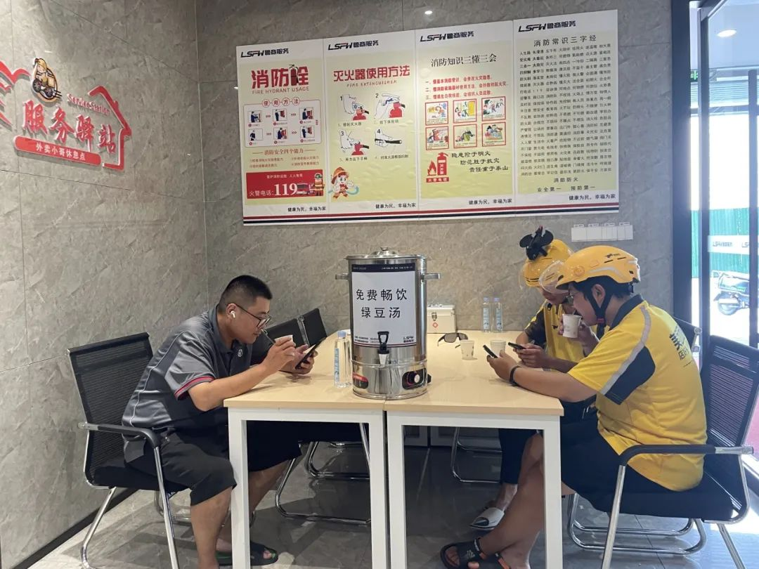 驿站为快递小哥们准备了桌椅板凳、应急药箱,同时准备了绿豆汤等免费饮品,能够满足快递小哥们吃饭、交流和简单的休息需求。“我们希望通过驿站的建立,更广泛、更直接、更有效的服务新就业形态劳动者,用实际行动践行诠释‘五心’服务理念。同时,也方便他们更好地服务我们的业主,实现善意的循环,共同营造温馨、和谐的社区环境。”凤凰广场项目负责人表示。