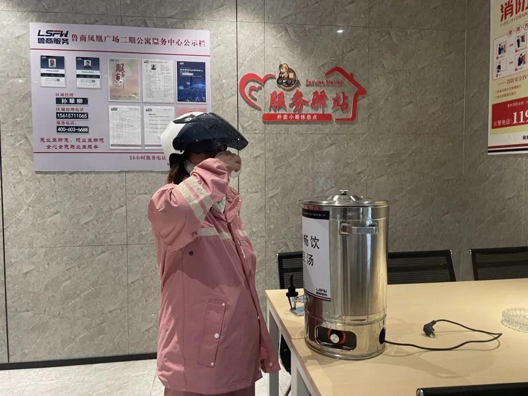 近日,鲁商服务济南城市公司凤凰广场项目联合社区及街道办,设立“劳动者服务驿站&快递小哥休息点”,为广大外卖员和快递小哥提供休息场所及消暑用品。