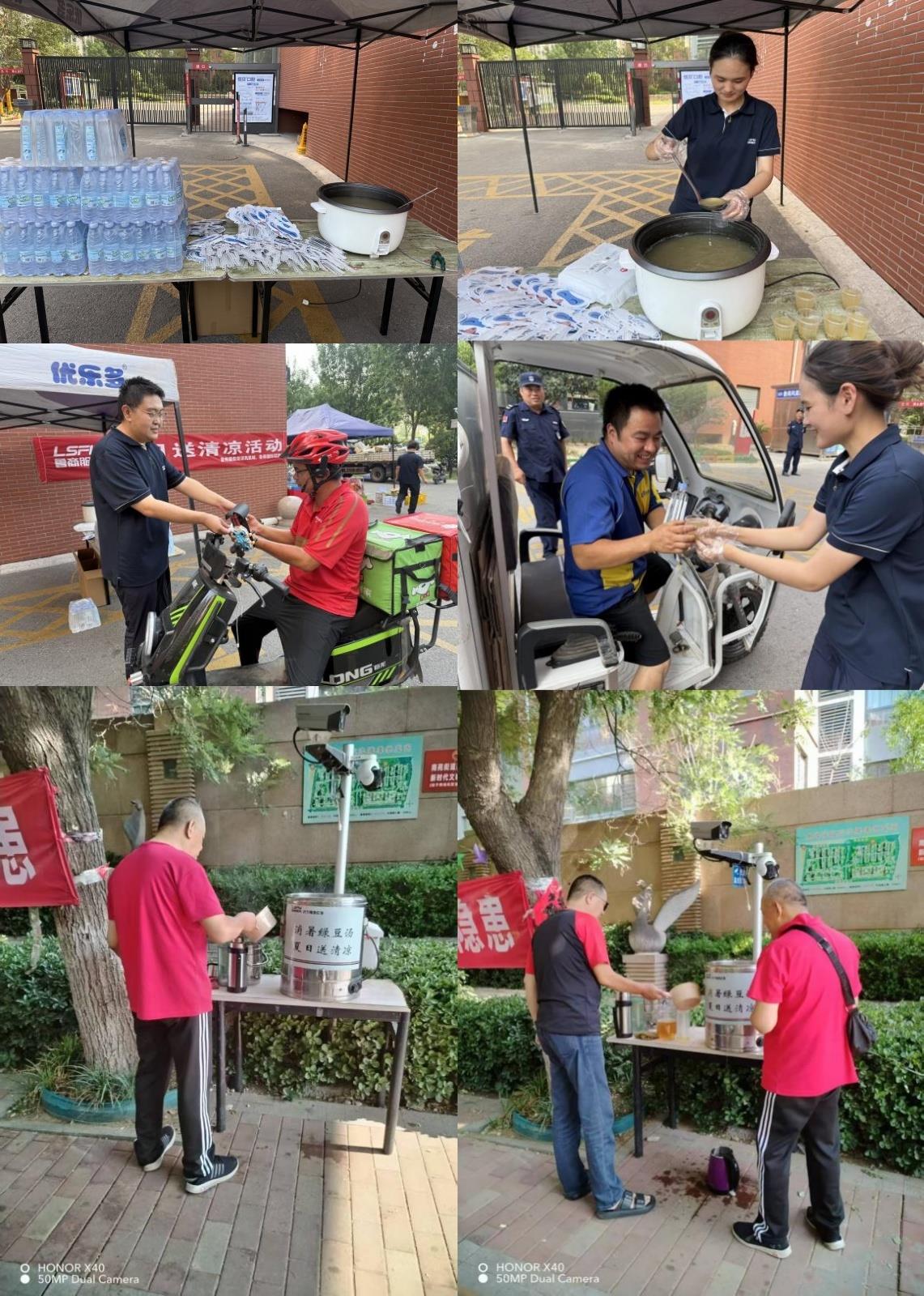 菏泽凤凰城和济宁南池公馆的工作人员为业主、快递员和外卖小哥送上贴心关怀——一把把印着温馨提示的扇子驱散燥热,一瓶瓶冰镇矿泉水解渴降温,一碗碗精心熬制的绿豆汤清甜解暑。接过清凉的瞬间,笑容在每个人脸上绽放。这份夏日里的惦念,是鲁商服务对业主的暖心守护,也是对户外工作者的真诚致敬。