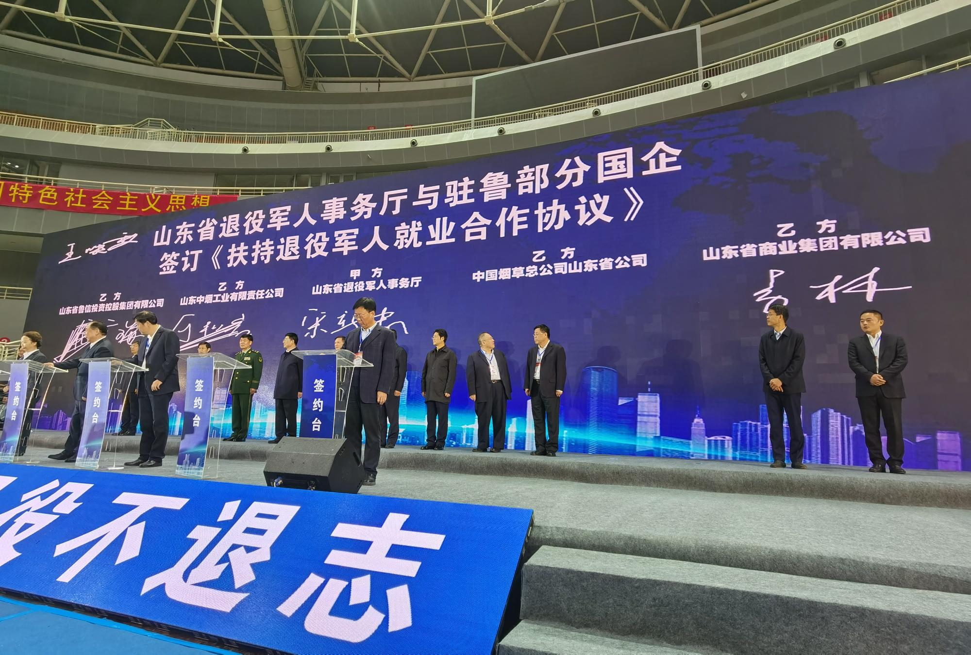 11月5日上午,省退役军人“就业直通车”专场招聘会在济南奥体中心东荷体育馆举行,副省长、省公安厅厅长范华平出席,省退役军人事务厅厅长时培伟主持启动仪式。现场,省退役军人事务厅与省商业集团有限公司(以下简称鲁商集团)等9家驻鲁国企签署了《扶持退役军人就业合作协议》,鲁商集团党委常委、组织人力资源部部长李林代表集团签约。