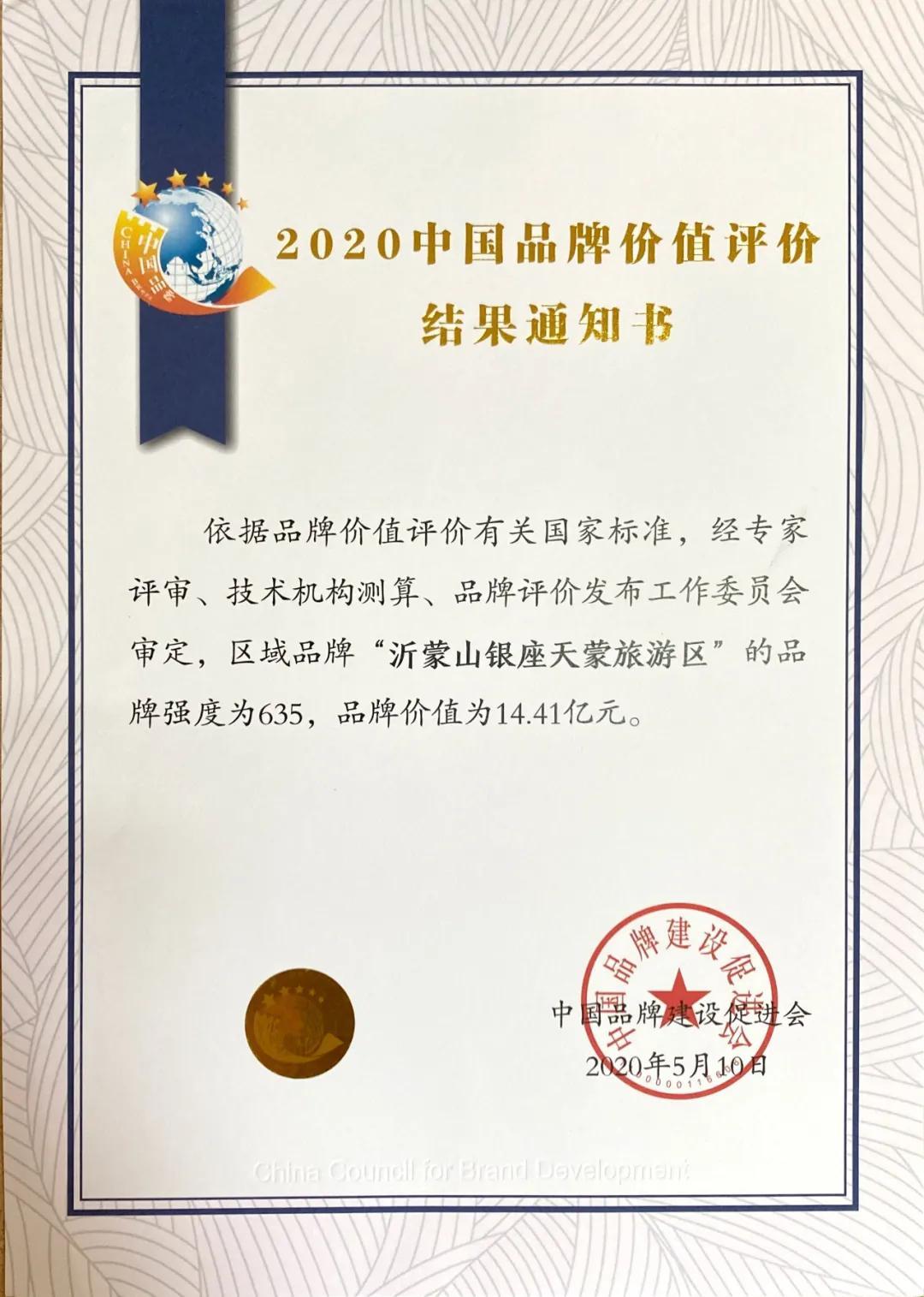 近日,中国品牌建设促进会联合中国资产评估协会、国务院国资委新闻中心等机构,通过云端发布《2020中国品牌价值评价信息》,沂蒙山银座天蒙旅游区品牌价值达14.41亿!