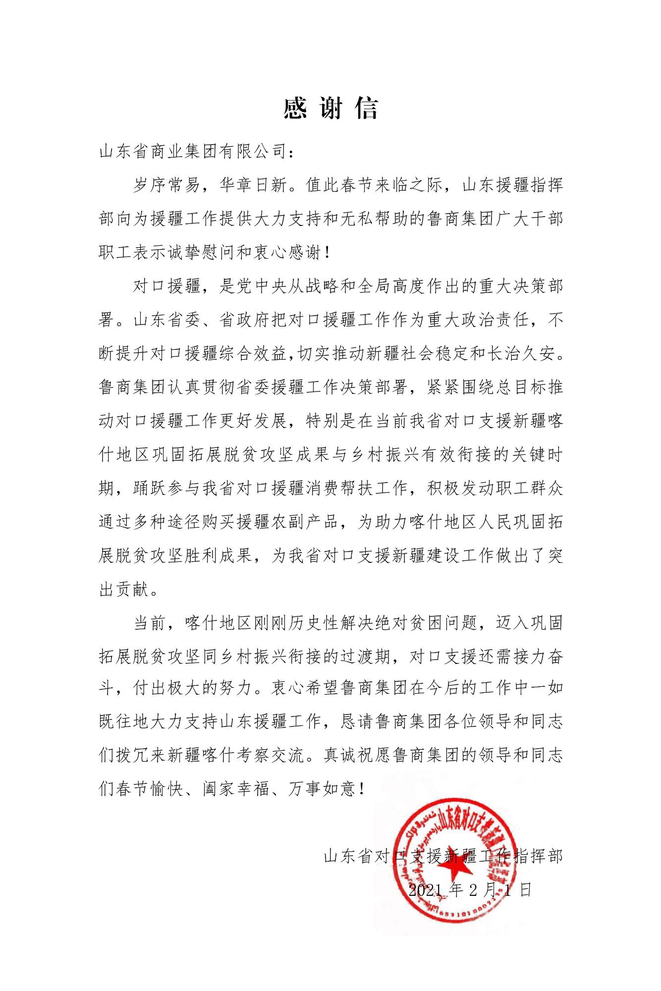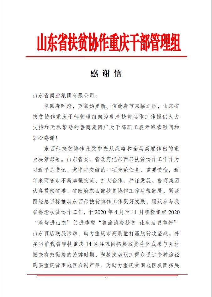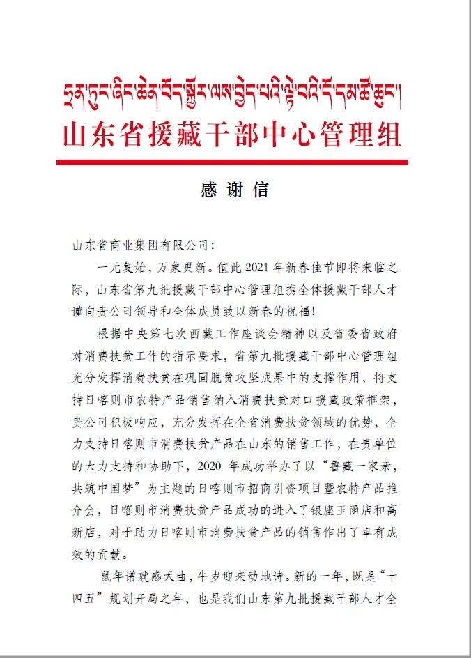 感谢信中表示,鲁商集团认真贯彻省委省政府有关东西部扶贫协作工作决策部署,紧紧围绕总目标推动对口支援工作更好发展,踊跃参与我省对口支援消费帮扶工作,积极发动职工群众通过多种途径购买帮扶农副产品,为助力西部人民巩固拓展脱贫攻坚胜利成果,为我省对口支援西部地区建设工作作出了突出贡献。尤其是在成功举办以“鲁藏一家亲,共筑中国梦”为主题的日喀则市招商引资项目暨农特产品推介会、“渝货进山东”促进季暨“鲁渝消费扶贫让生活更美好”山东百店联展活动等方面,积极发挥鲁商集团产业链长的优势,充分利用集团零售业的品牌资源,助力扶贫事业发展。