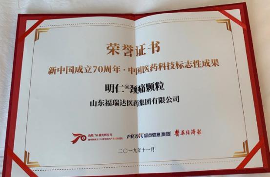 11月4日,“2019全国医药经济信息发布会暨米房会年会”在广州开幕。在大会组织筹办的“致敬70载光辉岁月——新中国成立70周年医药产业成果巡礼”活动中,福瑞达医药集团公司明星产品明仁颈痛颗粒荣登“中国医药科技标志性成果”榜单。
