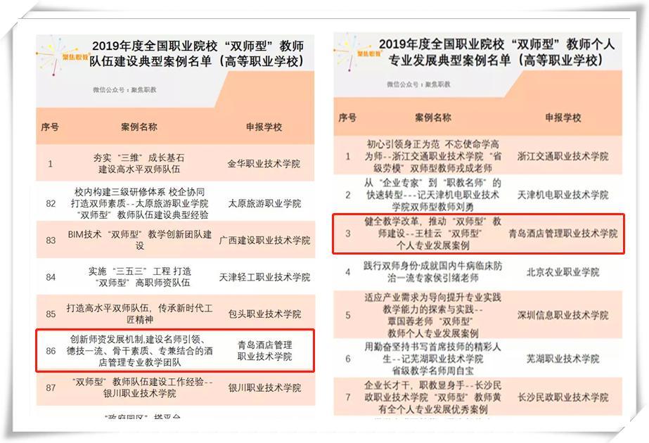 近日,教育部职业技术教育中心研究所发布《2019年度全国职业院校“双师型”教师队伍建设典型案例》,青岛酒店管理职业技术学院(简称青岛酒店管理职院)两个案例成功入选。