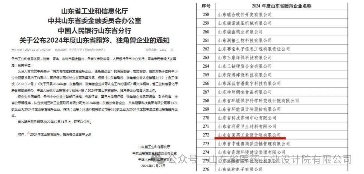 12月27日,省工信厅公布2024年度山东省瞪羚、独角兽企业名单,省医工院凭借卓越的高成长性、高发展潜力和高科技创新能力,成功获评2024年度山东省瞪羚企业。