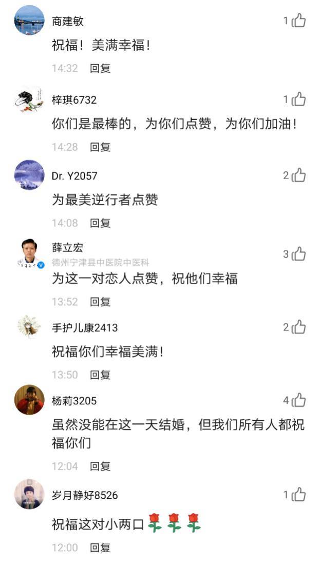 虽然没能在“20200202”这个千年一遇的日子完成终身大事,但是他们感人的事迹收获了无数祝福。网友们纷纷给他们留言,为他们点赞。