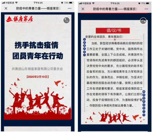 当前,新冠肺炎疫情防控工作正处于关键时期。2月10日,银座家居团委发出主题为“携手抗击疫情,团员青年在行动”的倡议书,动员全体团员、青年立即行动,投身于疫情防控工作,为遏制疫情扩散、夺取防控斗争胜利贡献出青春力量。
