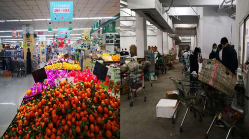 早上8:00,物业部同事开始了营业前消杀工作,对卖场、办公区的购物车、生鲜柜台、收银台、地面、门把手、加工间、卫生间、餐厅、垃圾桶、更衣室等进行全面消毒灭菌处理。蔬菜配货车到达,为配货司机测温、登记、消毒,在停车场外完成第一道检测。