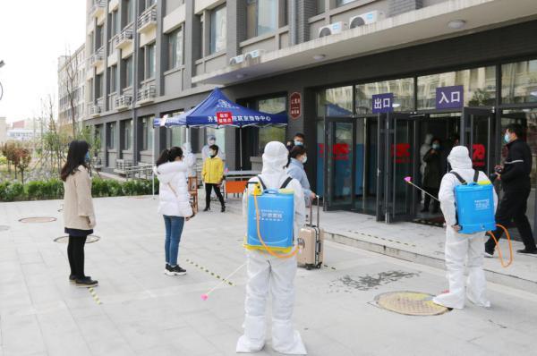 医务人员对体温异常同学进行腋下体温复查,体温显示正常,做好信息登记、行李消毒后,允许该同学入校,工作人员对留观点进行全面消毒。