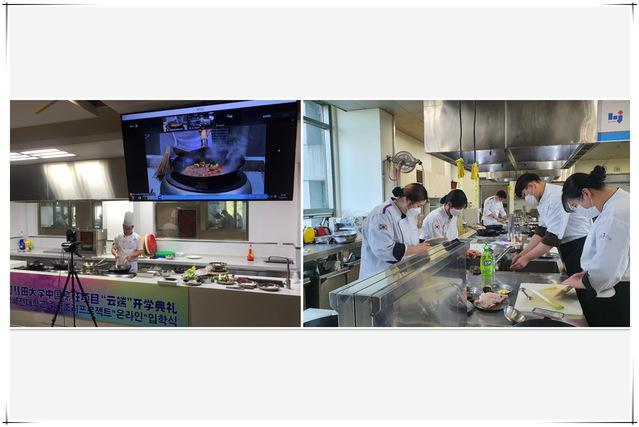 9月21日中午,2020年韩国彗田大学中国烹饪项目——中国鲁菜网络教学“云端”开学典礼在青岛酒店学院中餐实训室举行。