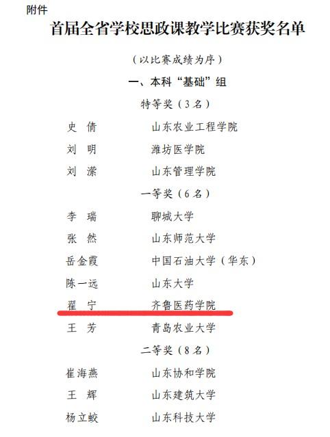 近日,山东省教育厅发布《关于公布首届全省思政课教学比赛结果的通知》,齐鲁医药学院青年教师翟宁获得该比赛本科“基础”组一等奖。