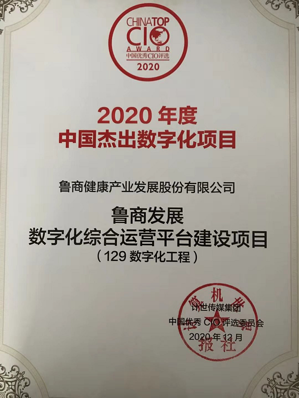 12月19日,“中国CIO高峰论坛暨2020年度中国优秀CIO颁奖典礼”在北京举行。鲁商发展数字化综合运营平台建设项目(简称129工程)荣获“2020年度中国杰出数字化项目”奖,鲁商发展首席信息官董勤林荣获“2020年度中国杰出CIO TOP5”称号。