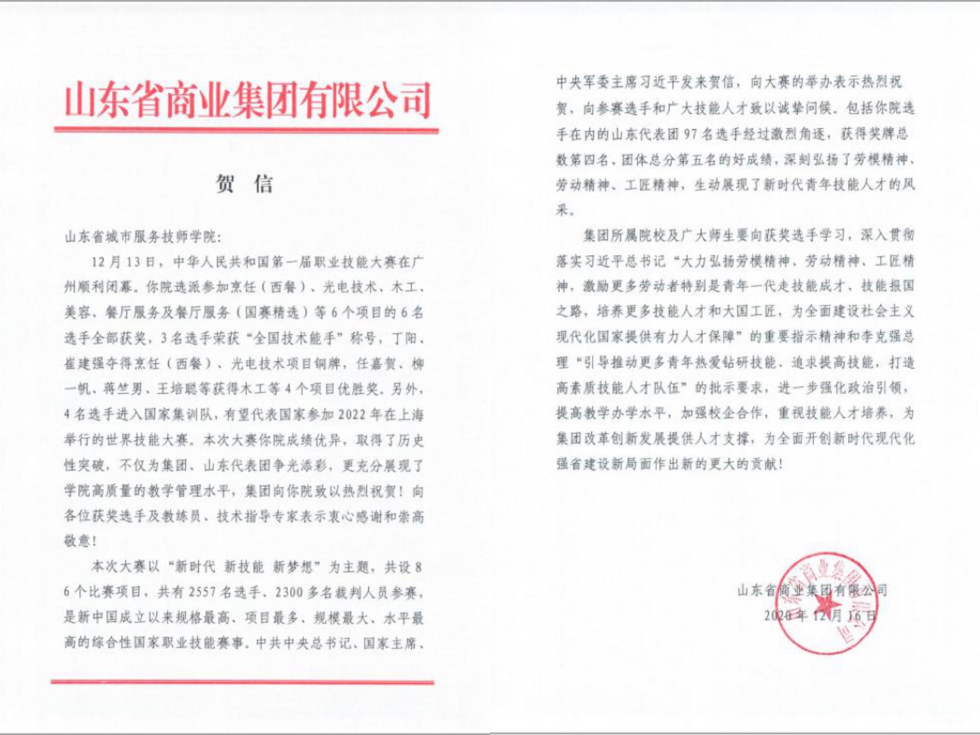12月13日,首届全国职业技能大赛在广州顺利闭幕。省城市学院选派参加烹饪(西餐)、光电技术、木工、美容、餐厅服务及餐厅服务(国赛精选)项目的6位选手全部获奖,其中3位选手荣获全国技术能手称号,有4位选手进入国家集训队,有望参加2022年在上海举行的世界技能大赛。鲁商集团赛后致贺信,对学院取得的优异成绩表示祝贺!