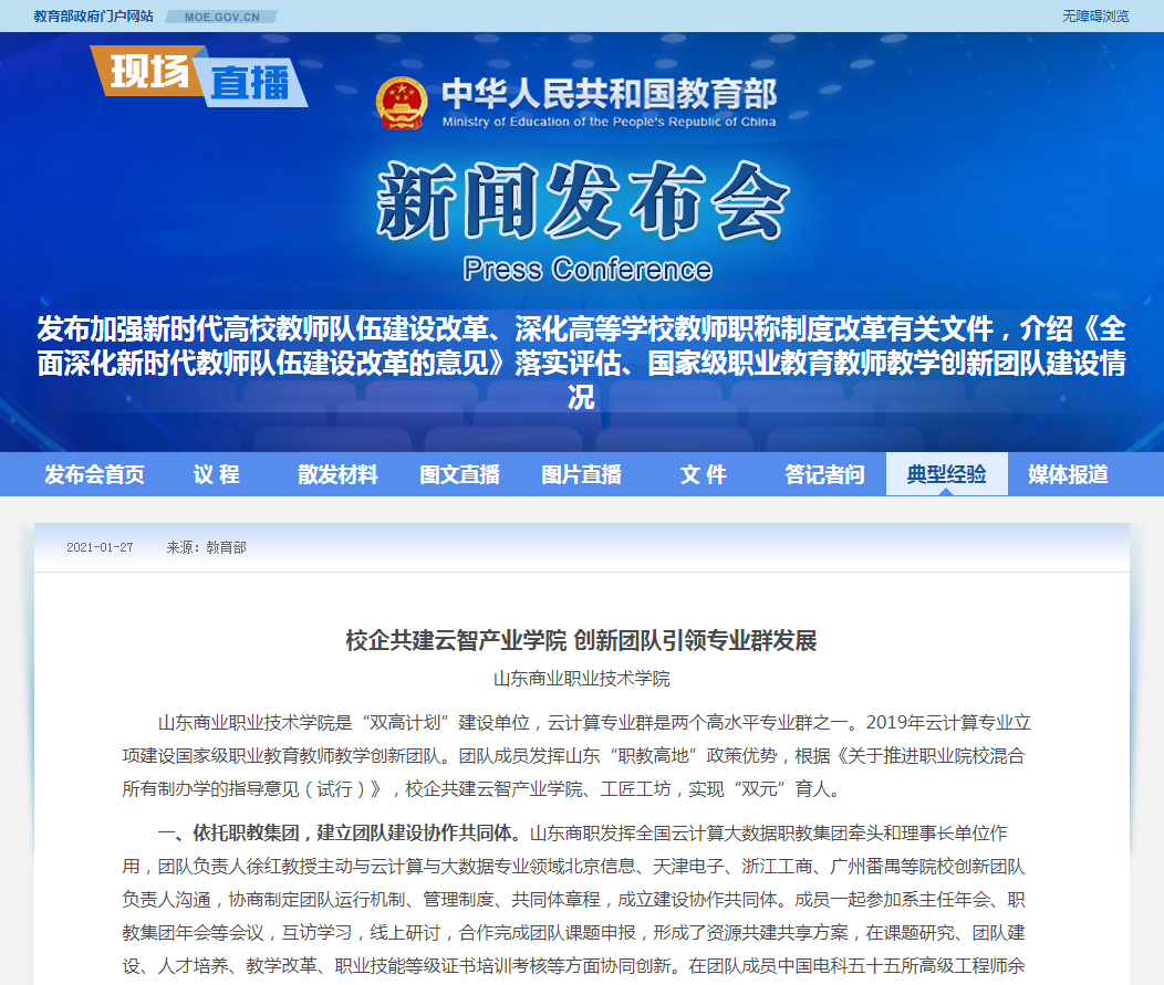 1月27日,教育部举行新闻发布会,山东商院云计算国家职业教育教师教学创新团队“校企共建云智产业学院 创新团队引领专业群发展”的经验总结作为现场新闻发布素材,并在教育部网站发布会专区“典型经验”栏目予以推广。