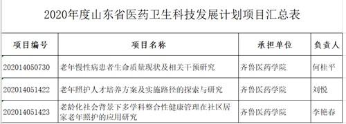 近日,从省卫生健康委员会《关于下达2020年度山东省医药卫生科技发展计划项目的通知》(鲁卫函〔2021〕36号)文件获悉,齐鲁医药学院推荐的3个项目全部获批立项,分别是何桂平老师主持的《老年慢性病患者生命质量现状及相关干预研究》,项目编号202014050730;刘悦老师主持的《老年照护人才培养方案及实施路径的探索与研究》,项目编号202014051422;李艳春老师主持的《老龄化社会背景下多学科整合性健康管理在社区居家老年照护的应用研究》,项目编号202014051423。