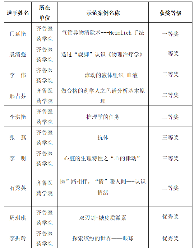 近日,省高等医学教育研究中心公布了2021年度省高等医学院校课程思政示范案例评选结果,齐鲁医药学院申报的10项案例全部获奖,其中一等奖2项、二等奖2项、三等奖4项、优秀奖2项。