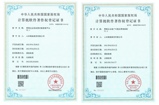 近日,银座家居供应商返款对账平台、商户可视化管理系统2项数字化转型成果先后取得国家版权局计算机软件著作权登记证书。