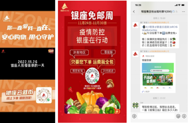 为加大“银座云逛街”自有平台的应用推广,银座集团积极通过定向投流、免邮、附二维码包装袋等方式提升覆盖面,并借助“抖音本地生活”平台进行日播引流,11月“银座云逛街”订单量环比增长超过200%,19家门店接连创新高;利用私域会员群、视频号、抖音等平台,制作发布定向保供、线上购物指引、爱心助农等主题视频,实现公域、私域互促引流,11月23日至29日间,“银座云逛街”平台新增用户环比增长368%,访问人数环比增长144%。数据攀升的同时,广大消费者的各类好评也纷至沓来,商品新鲜、分量十足、包装整洁、配送及时……对“银座云逛街”的功能创新与服务优化给予肯定,顾客的反馈承载了广大消费者对银座品牌的充分信任,为持续推动公司线上业务模式创新注入强劲动力。