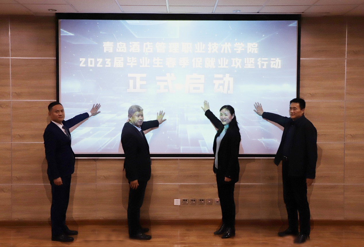 仪式上,秦冬梅、李凯伟、李达、姜玉鹏共同为青岛酒店学院2023届毕业生春季促就业攻坚行动启幕。学校将通过开展此次行动,聚焦当前工作重点难点,挖潜创新开拓更多市场化岗位,抓住时机开展校园招聘,突出精准做实做细就业指导帮扶,引导毕业生主动求职,加力加快推进就业工作进程,为确保2023届毕业生就业局势稳定奠定坚实基础。