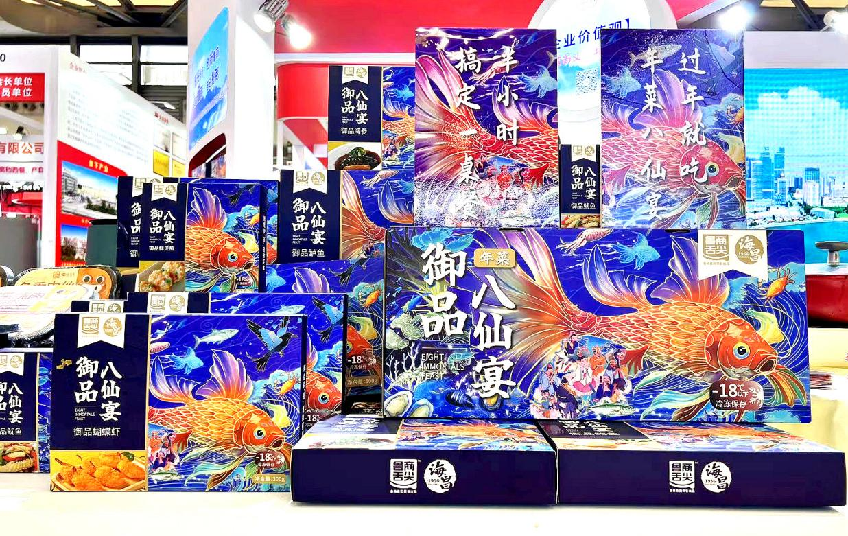在北京展览馆3号展馆入口处正对面,映入眼帘的是一桌包含海参、鲍鱼、鲈鱼、鱿鱼、虾等高端食材的年菜“御品八仙宴”,以及鲅鱼饺子、土豆泥等特色主食,吸引了许多前来看展的市民驻足品鉴。