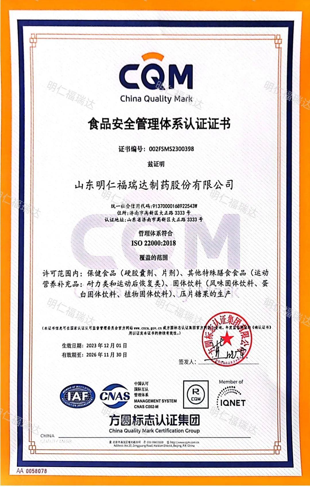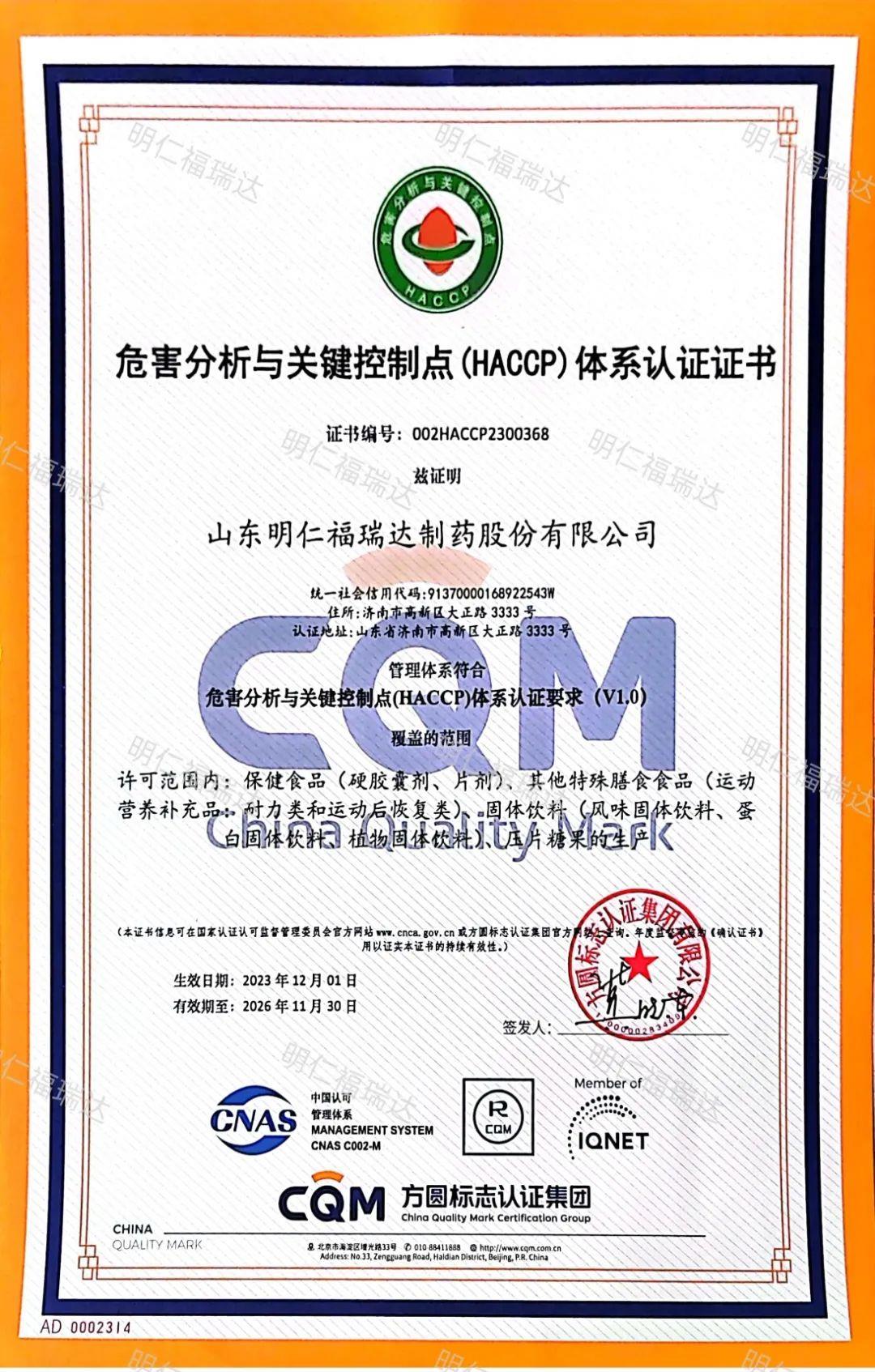 近日,明仁福瑞达顺利通过食品安全管理体系和HACCP体系认证。