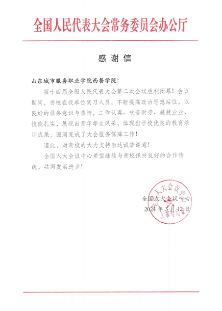 3月12日,全国人大会议中心给山东城市服务职院西餐学院发来感谢信,对学院服务十四届全国人大二次会议的学生予以高度赞扬,对学院的大力支持表达诚挚谢意。