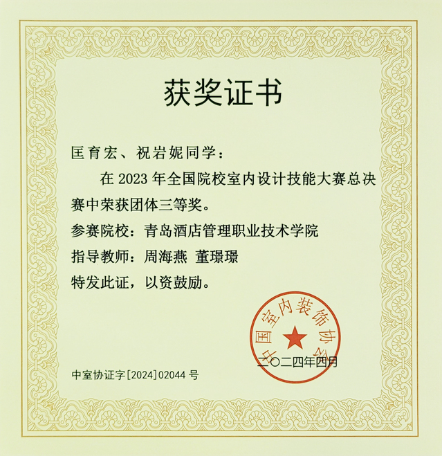近日,2023年全国院校室内设计技能大赛总决赛举行,青岛酒店管理职院参赛队伍荣获团体三等奖,周海燕、董璟璟老师荣获优秀指导教师。