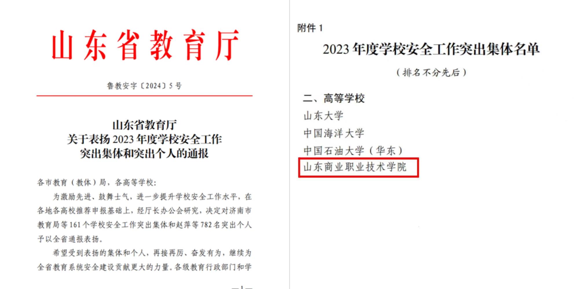 近日,山东省教育厅发布《关于表扬2023年度学校安全工作突出集体和突出个人的通报》,山东商职学院获评2023年度全省校园安全工作突出集体。