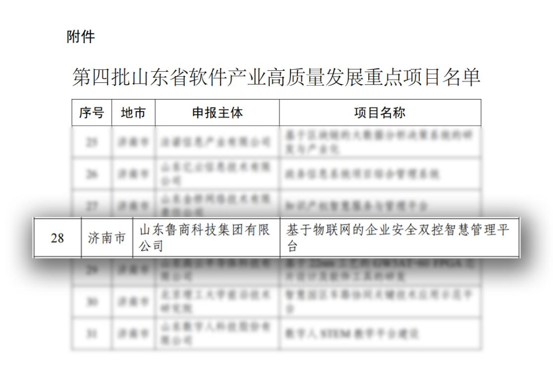 近日,山东省工信厅公布第四批山东省软件产业高质量发展重点项目名单,鲁商科技申报的“基于物联网的企业安全双控智慧管理平台”项目顺利入选。