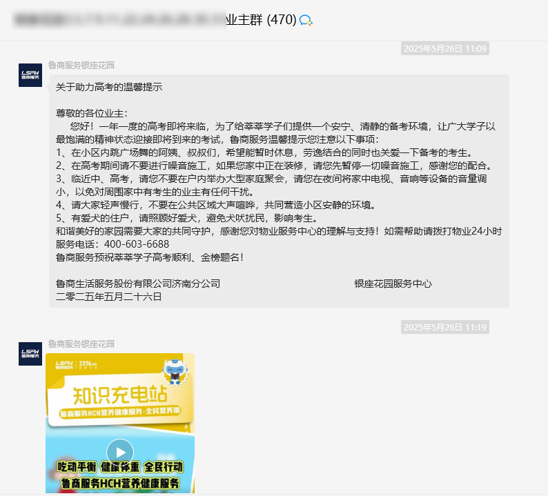 每一次轻声细语的提醒,每一条温暖人心的祝福,汇聚成的不仅是当下的静音环境,更是邻里守望相助、社区温情脉动的力量。此次多城联动的护考行动,是鲁商服务“用心守护美好生活”理念的生动实践。鲁商服务将持续完善应急响应机制,优化符合业主需求的特色服务,并探索建立覆盖更多生活场景的“温情守护”预案,持续构筑更具人文关怀的幸福家园。