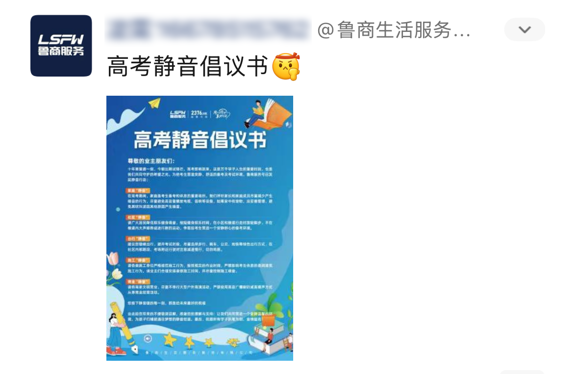 高考前夕,鲁商服务济南城市公司以“静音”为核心,打造全周期护考体系。各小区通过“线上+线下”立体宣传,在公告栏、电梯间等10余类场景发布静音倡议,并创新建立“噪音管控责任网格”,由工作人员分区劝阻广场舞、规范宠物管理,同步调整绿化修剪等作业时间。