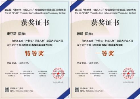 近日,2025年“外教社・词达人杯”全国大学生英语词汇能力大赛全国决赛圆满落幕。齐鲁医药学院学子在省赛中取得优异成绩,共获得特等奖1项、一等奖1项,二等奖8项,三等奖18项。