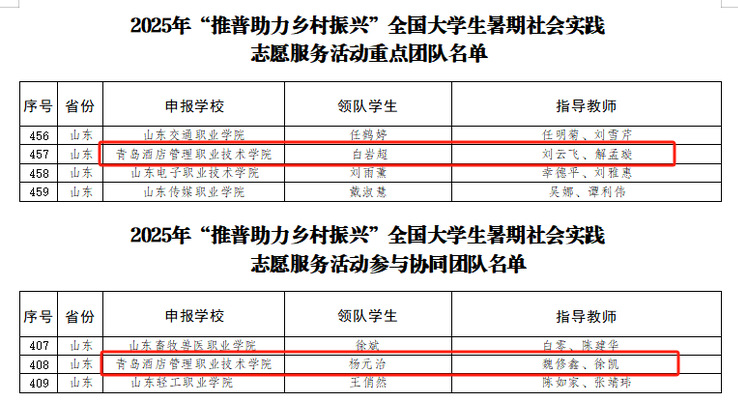 近日,教育部公布《2025年“推普助力乡村振兴”全国大学生暑期社会实践志愿服务活动入选团队名单》,青岛酒店管理职院“百村计划”推普助力乡村振兴志愿服务队、“青雁”推普助力乡村振兴服务队入选。入选团队数量较往年继续有所突破,位居山东省高职院校前列、青岛市高职院校首位。