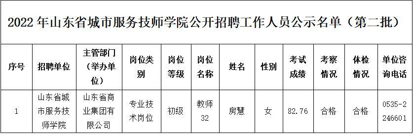根据《中共山东省委组织部、山东省人力资源和社会保障厅关于印发2022年度省属事业单位公开招聘工作实施方案的通知》鲁人社发〔2021〕18号)等相关规定,山东省城市服务技师学院经过公开招聘报名、考试、考察、体检等工作,现对拟聘用人员(第一批)进行公示,公示期为7个工作日,自2022年8月22日至2022年8月30日(不含节假日)。公示期间,如对公示人选有异议,请及时向山东省商业集团有限公司反映。