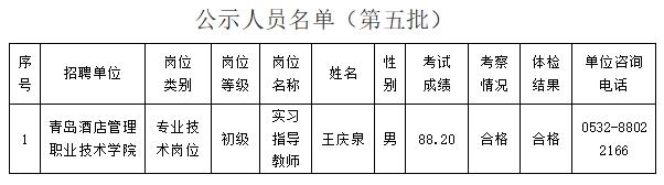 根据省属事业单位公开招聘有关政策规定,按照岗位招聘计划,青岛酒店管理职业技术学院组织完成了公开招聘考试、考察、体检等工作,现对该单位第五批拟聘用人员进行公示。公示期为7个工作日,自2024年7月17日至2024年7月25日(不含节假日)。公示期间,如对公示人选有异议,请向山东省商业集团有限公司反映。反映问题要实事求是,并告知真实姓名及联系方式。