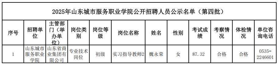 根据中共山东省委组织部、山东省人力资源和社会保障厅关于印发《2025年省属事业单位公开招聘工作实施方案的通知》(鲁人社发〔2024〕15号)要求等相关规定,山东城市服务职业学院经过公开招聘报名、考试、考察、体检等工作,现对拟聘用人员(第四批)进行公示,公示期为5个工作日,自2025年8月5日至2025年8月11日(不含节假日)。公示期间,如对公示人选有异议,请及时向山东省商业集团有限公司反映。